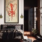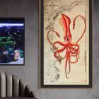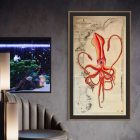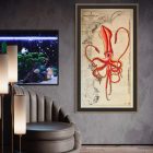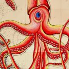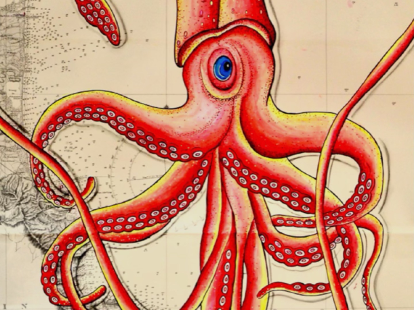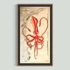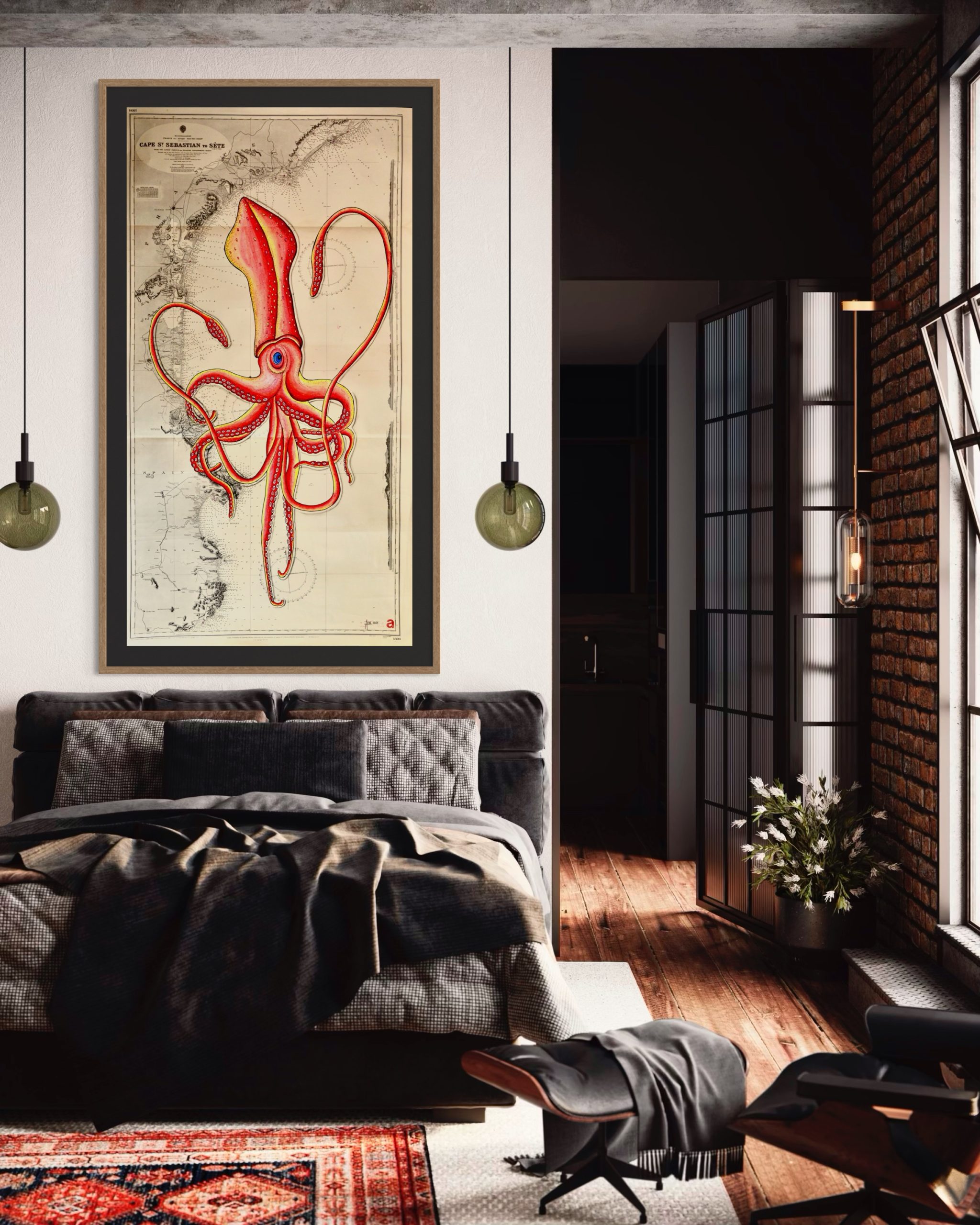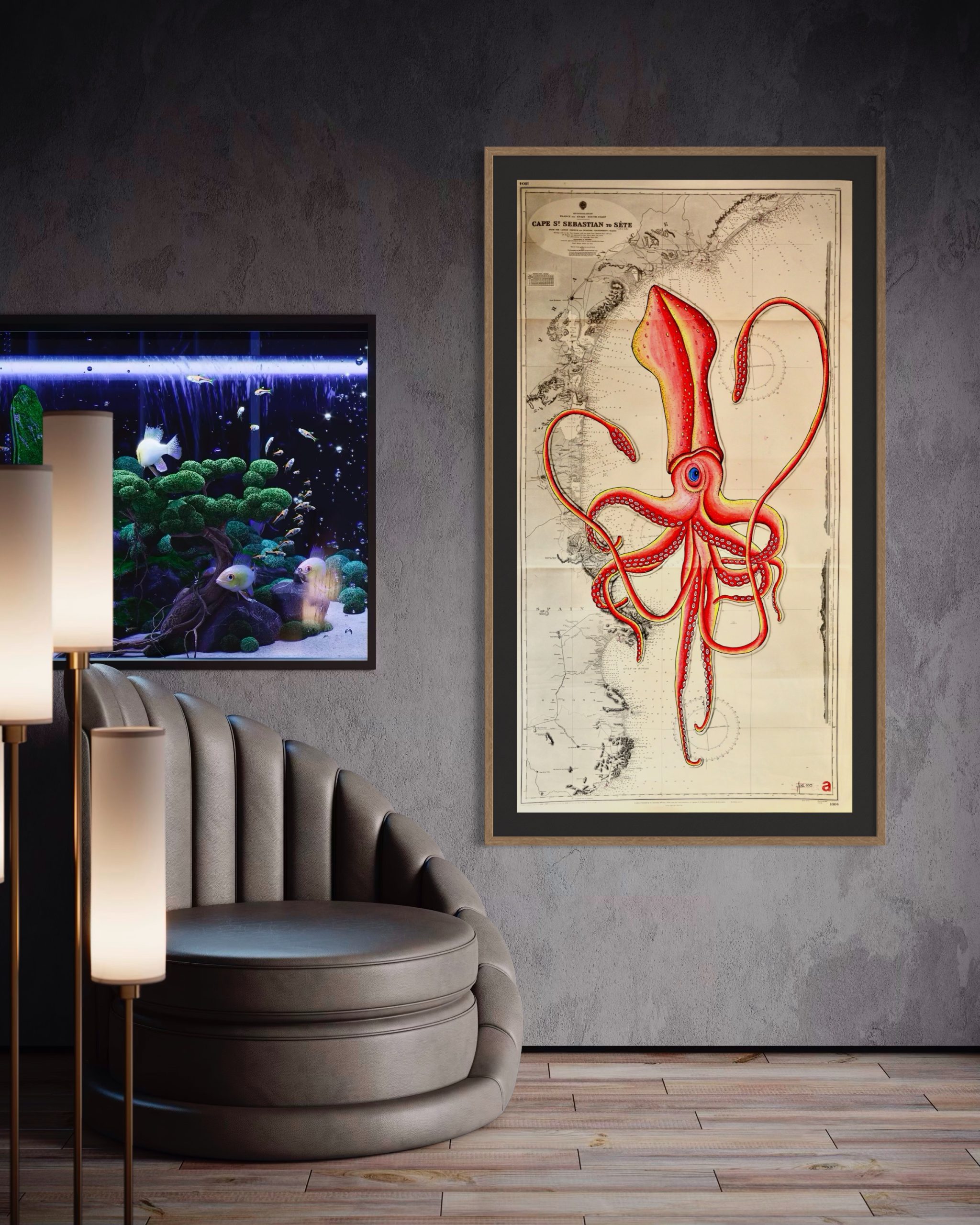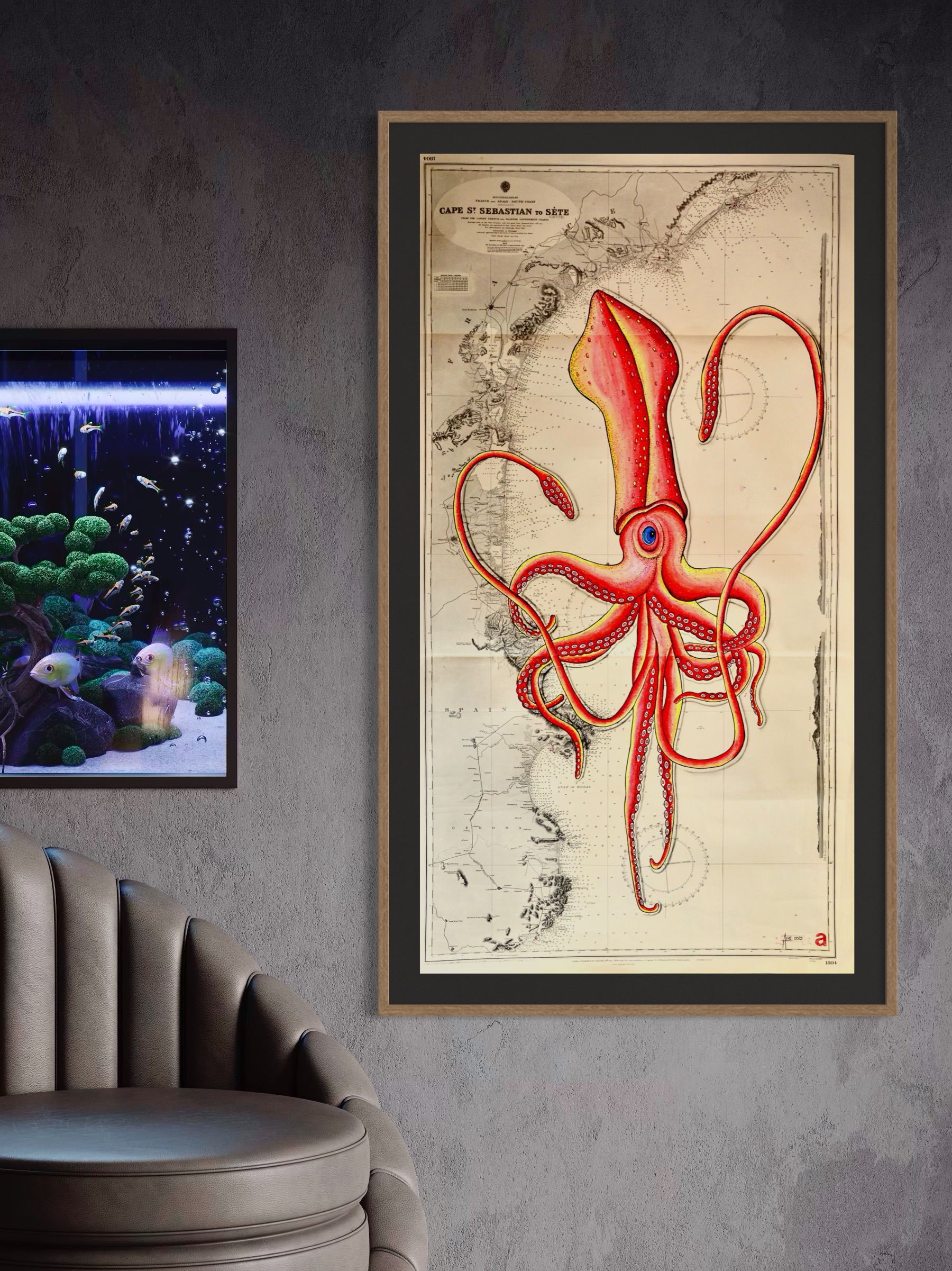 Calamar gigante dibujado sobre una carta náutica original de la Costa Brava y la Costa Azul. Su presencia es desafiante e inspira poder a través de la expresividad de sus tentáculos. La obra se realza con una paleta de colores brillantes, rojos, naranjas y amarillos que aportan energía y contraste a la composición. Técnica mixta de acrílico y estilográfica. Una impactante obra contemporánea que no deja indiferente.