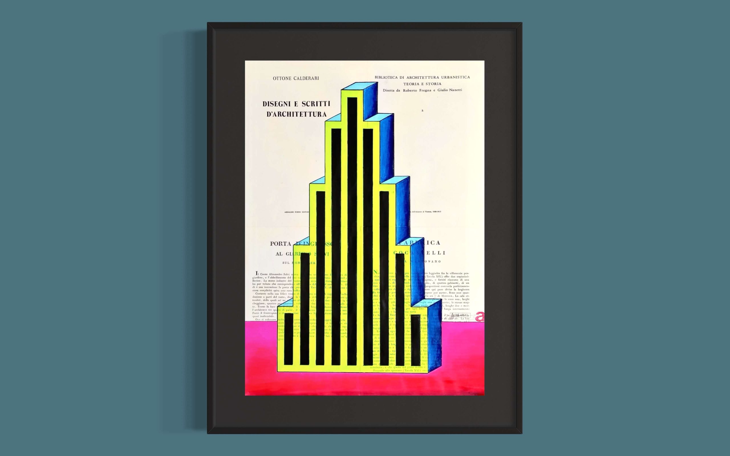 Diseños arquitectónicos inspirados en el movimiento futurista, con colores luminosos y formas geométricas y dinámicas, dibujados sobre páginas de libros de arquitectura.