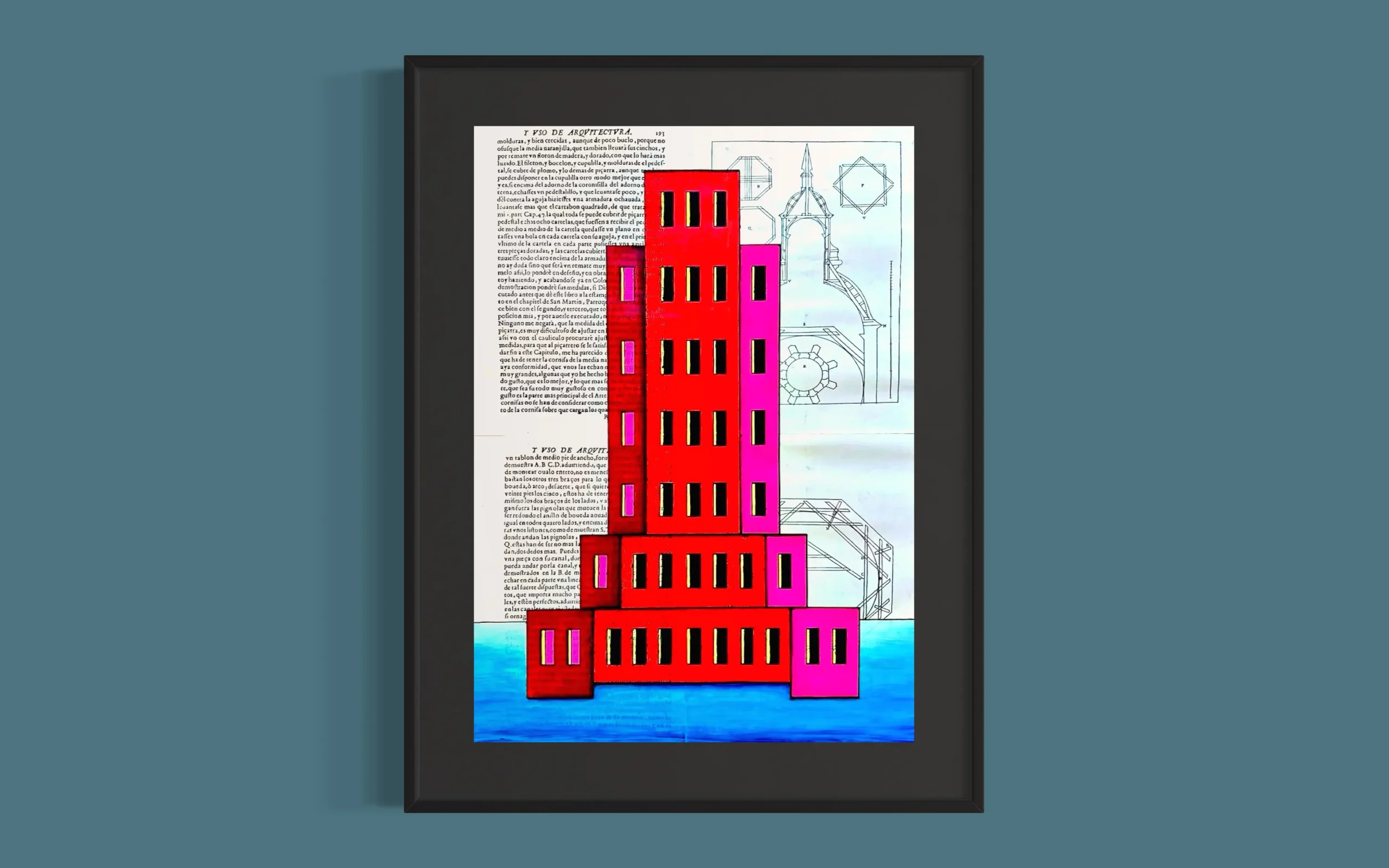 Diseños arquitectónicos inspirados en el movimiento futurista, con colores luminosos y formas geométricas y dinámicas, dibujados sobre páginas de libros de arquitectura.