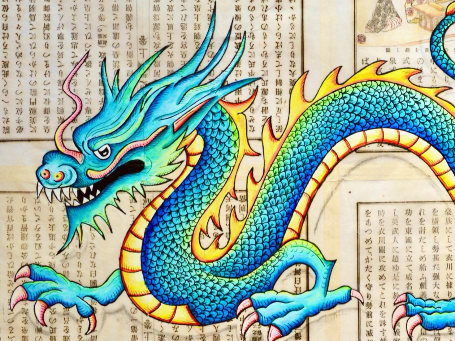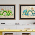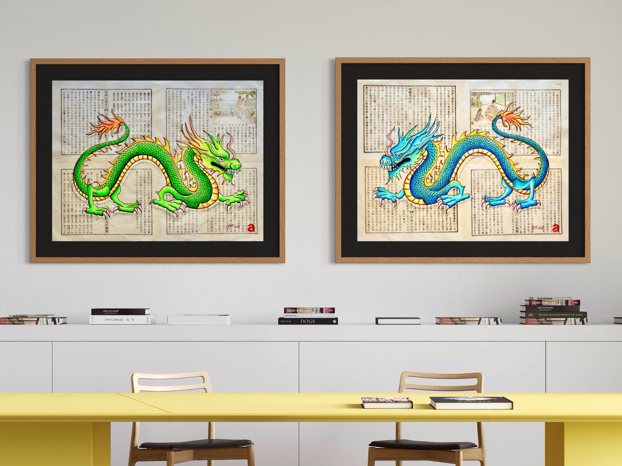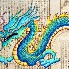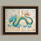 La obra representa un dragón oriental de cuerpo alargado y ondulante. La cabeza concentra gran fuerza expresiva, mientras el cuerpo escamado y la cola curvada aportan ritmo y continuidad visual. Predominan los azules, turquesas y verdes, animados por acentos en amarillo, naranja y rojo.