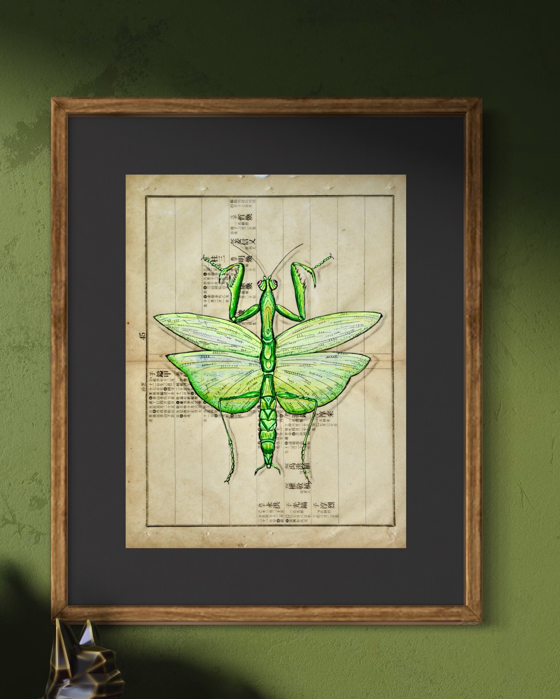En la cultura china, la mantis religiosa, debido a su postura que recuerda a una persona en oración o meditación, se considera un símbolo de buena suerte, prosperidad y longevidad. Además, se asocia con paciencia, perseverancia y la capacidad de conectarse con la naturaleza, aprovechando el momento oportuno para actuar.