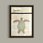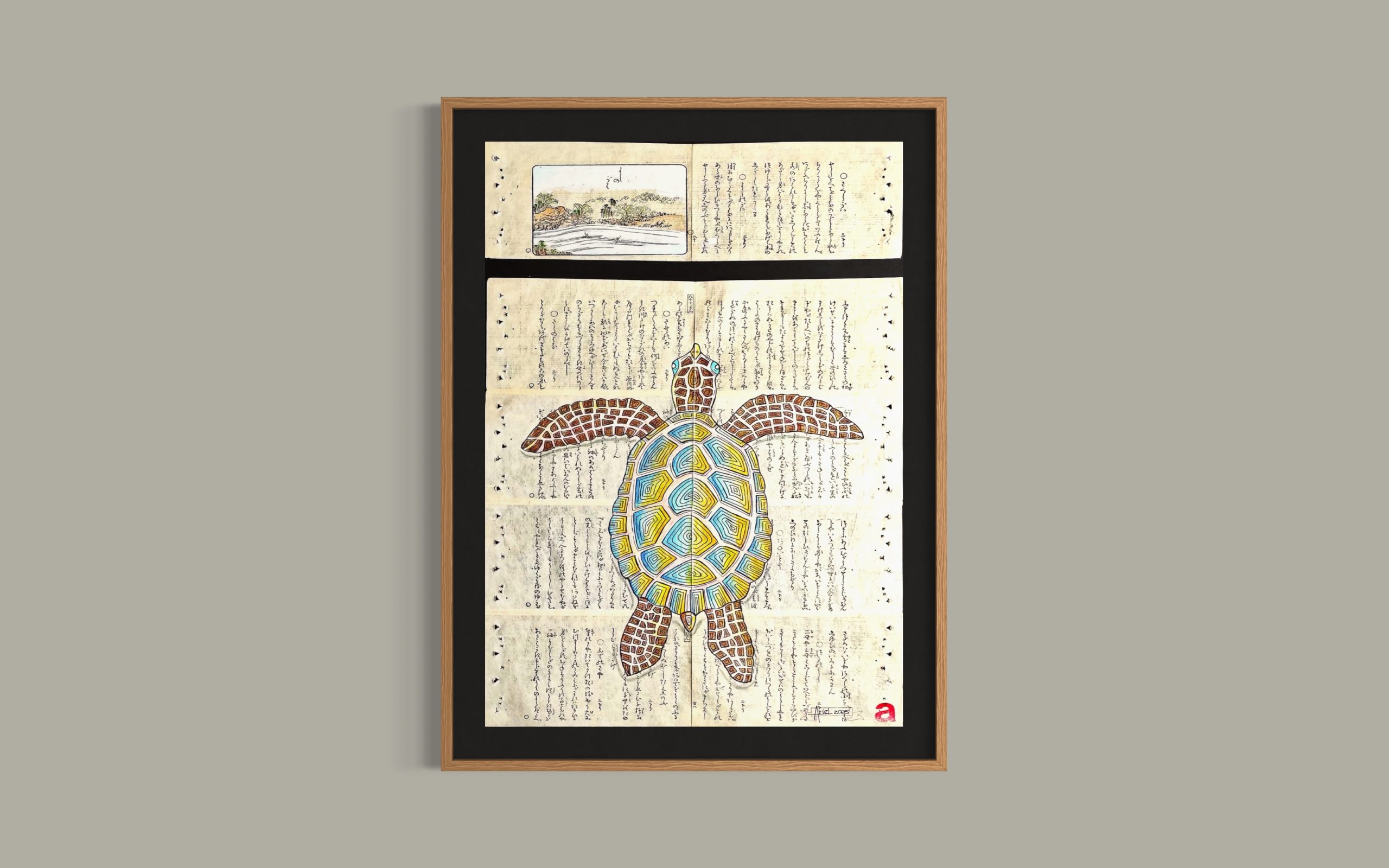 La tortuga ha sido dibujada sobre páginas de libro japonés originales en papel washi bicentenario, utilizando pinturas acrílicas iridiscentes y lapiceras estilográficas. Sus tonos turquesa, ocres y dorados varían en función de la luz.