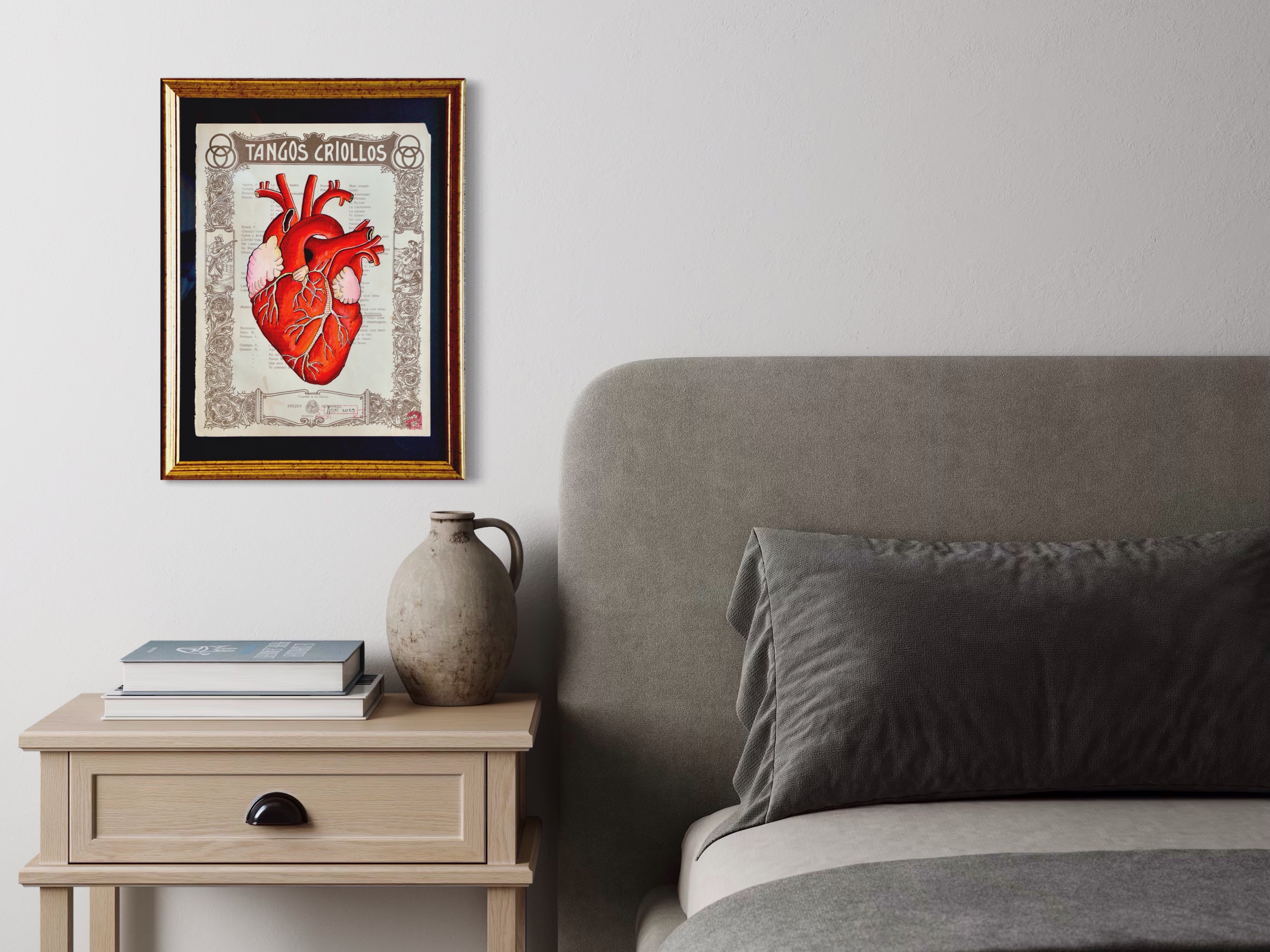 Materiales | Marco dorado. Paspartú negro. Cristal. |