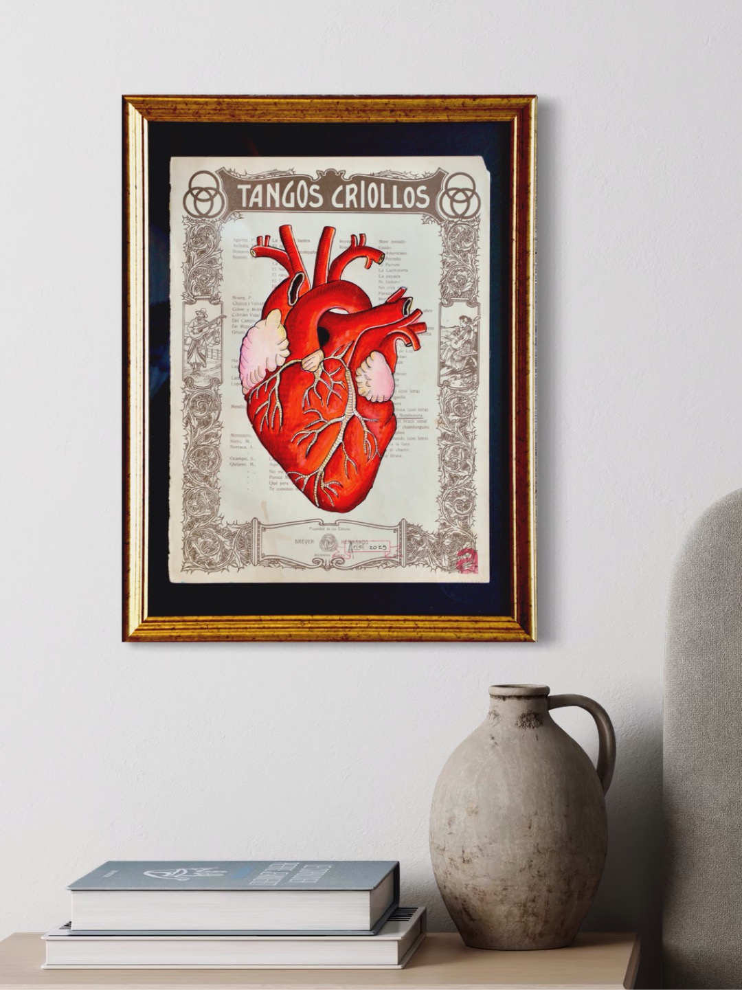 Diseño con estilográficas y pinturas acrílicas con efecto fluorescente sobre página de discografía de tangos criollos.