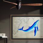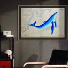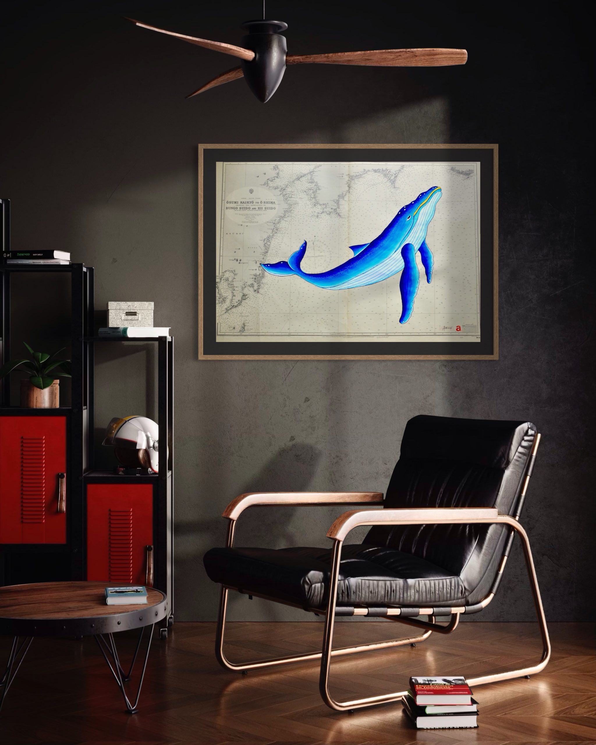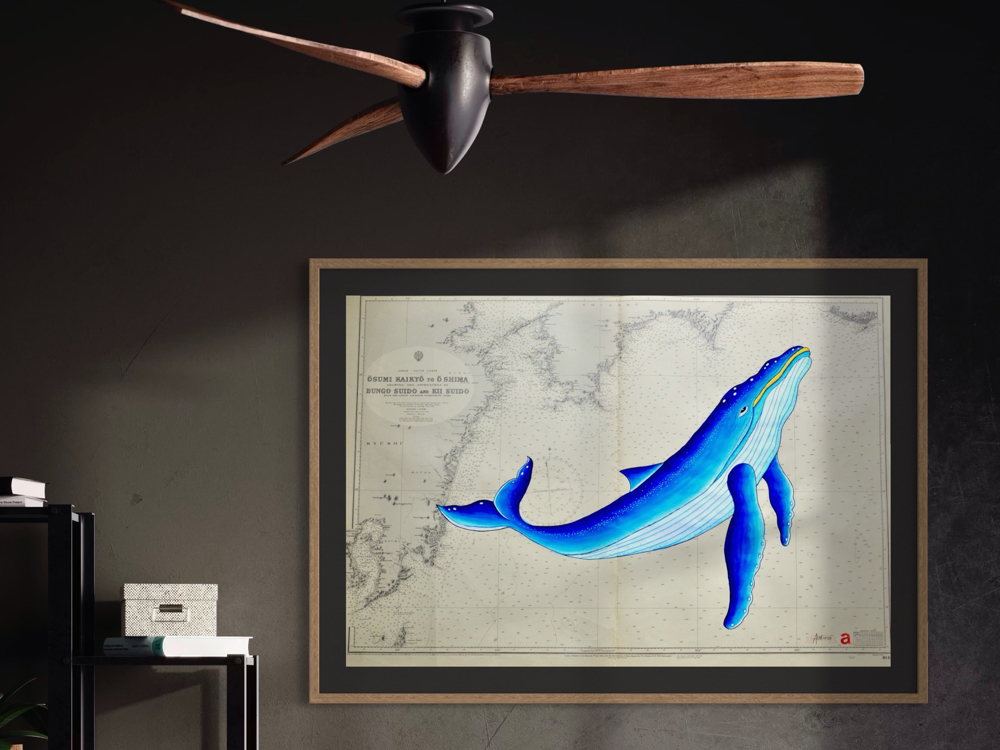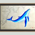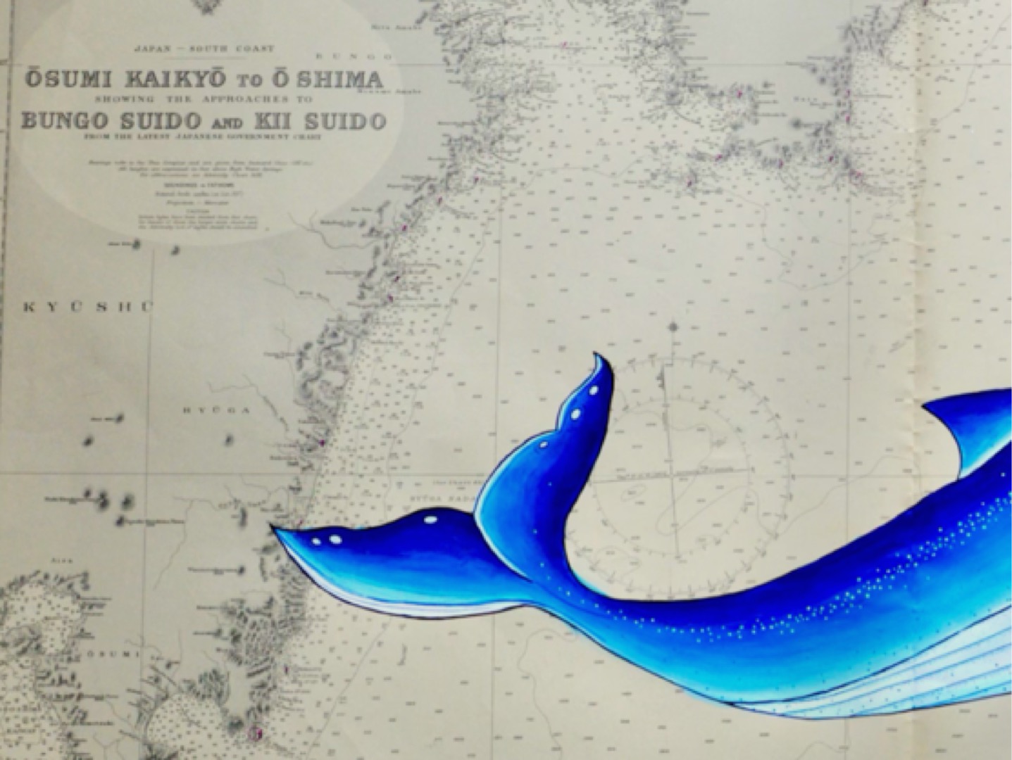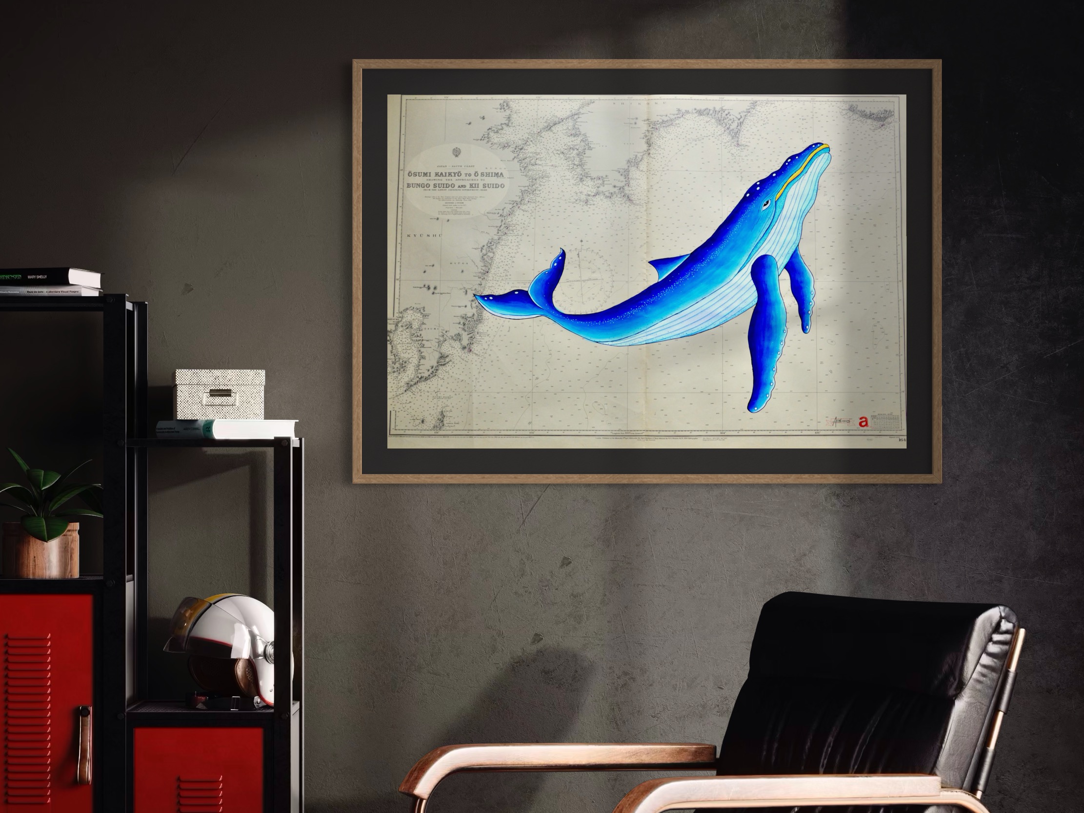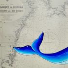 Sumérgete en las aguas de la costa sur de Japón con esta ballena de lineas curvas y color azul brillante que navega sobre una carta náutica original del 1950. Un diseño noble y fluido que evoca a la grandeza de estos seres marinos.