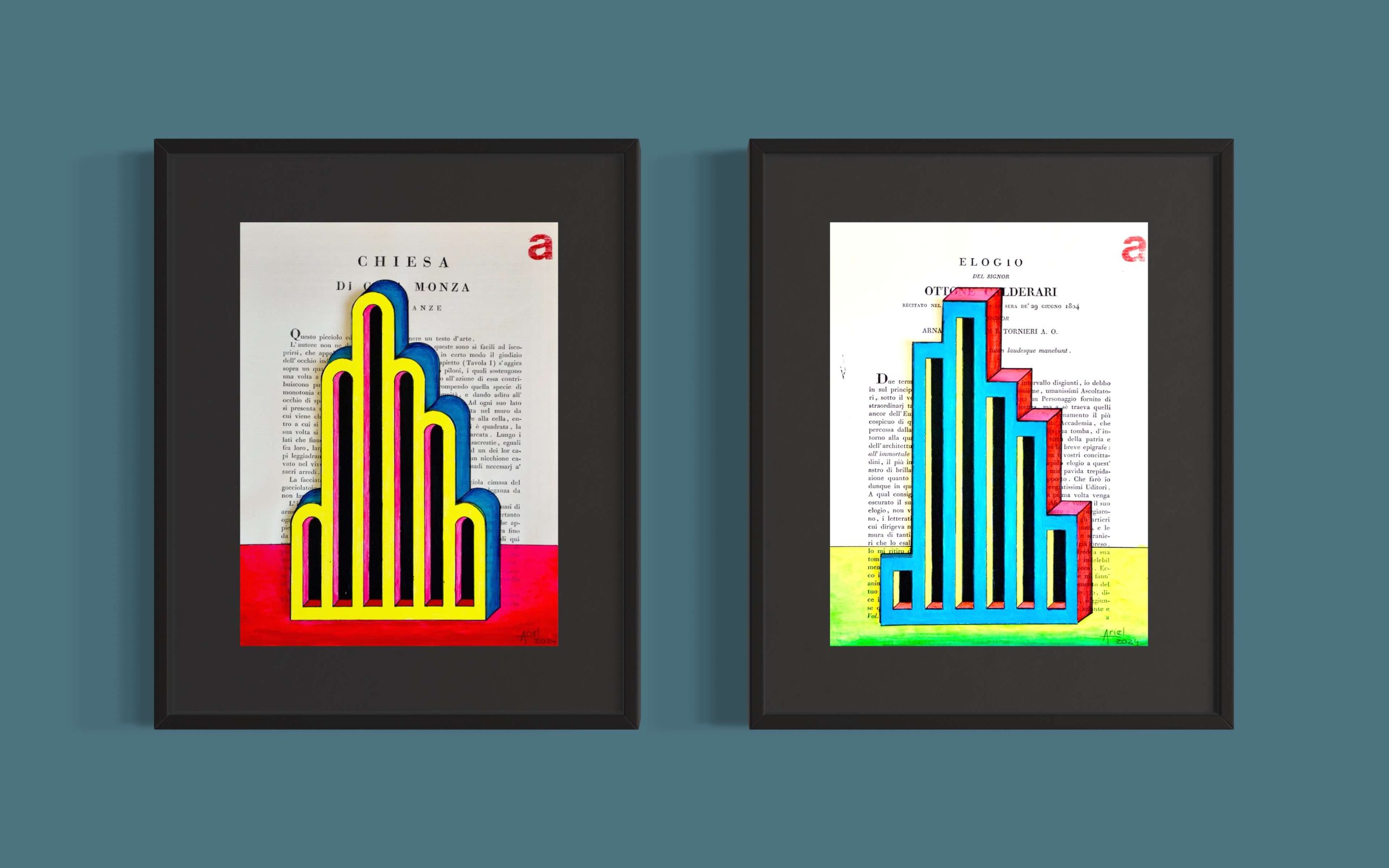 Diseños arquitectónicos inspirados en el movimiento futurista, con colores luminosos y formas geométricas y dinámicas, dibujados sobre páginas de libros de arquitectura. Los edificios están hechos con relieve, lo que genera un efecto de profundidad.