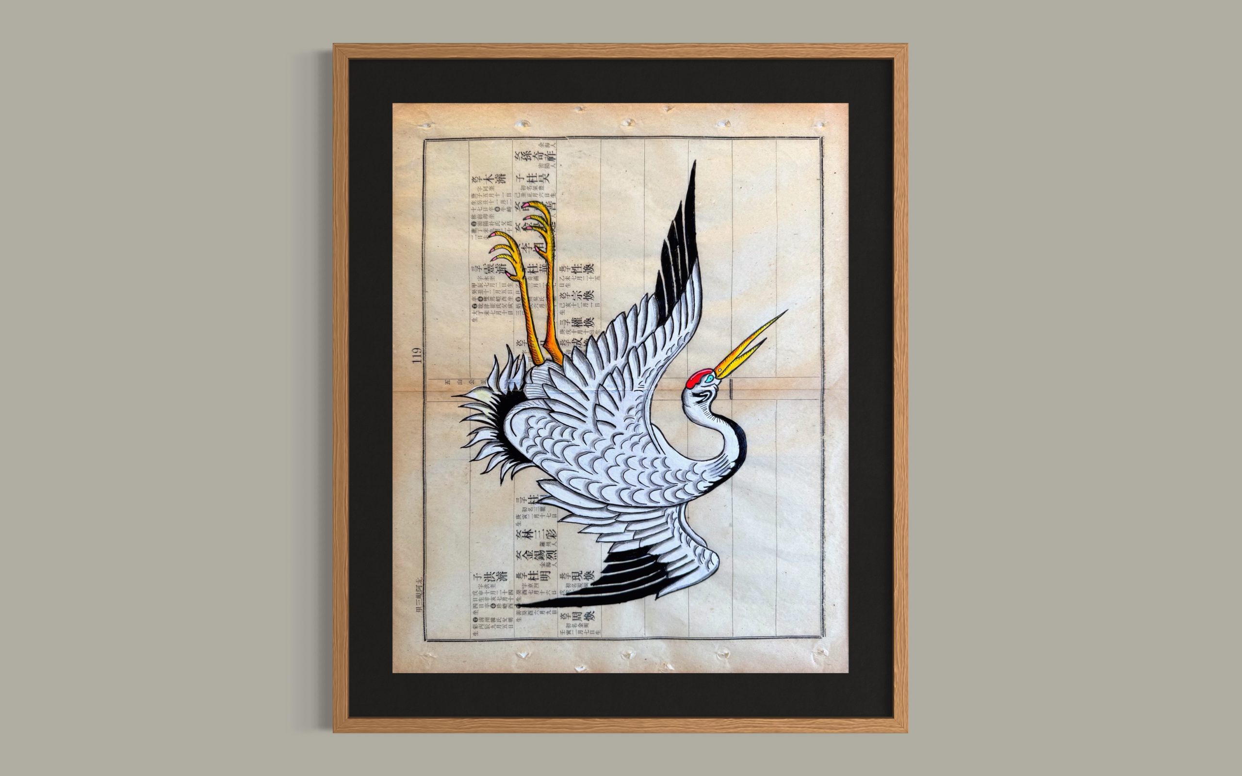 Grulla dibujada sobre documentos de censo originales coreanos (Seúl) de principios del S. XIX en papel de algodón y arroz.